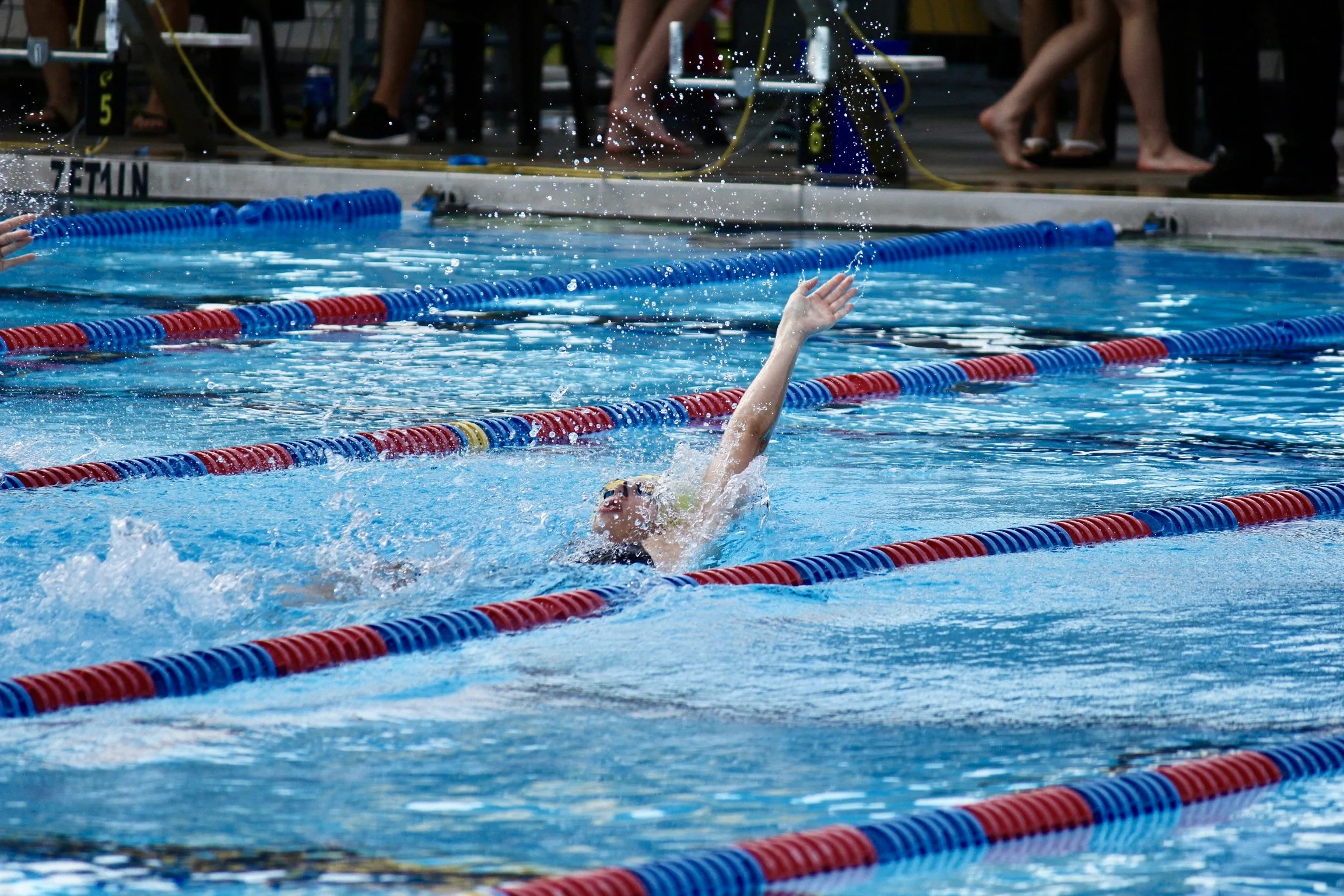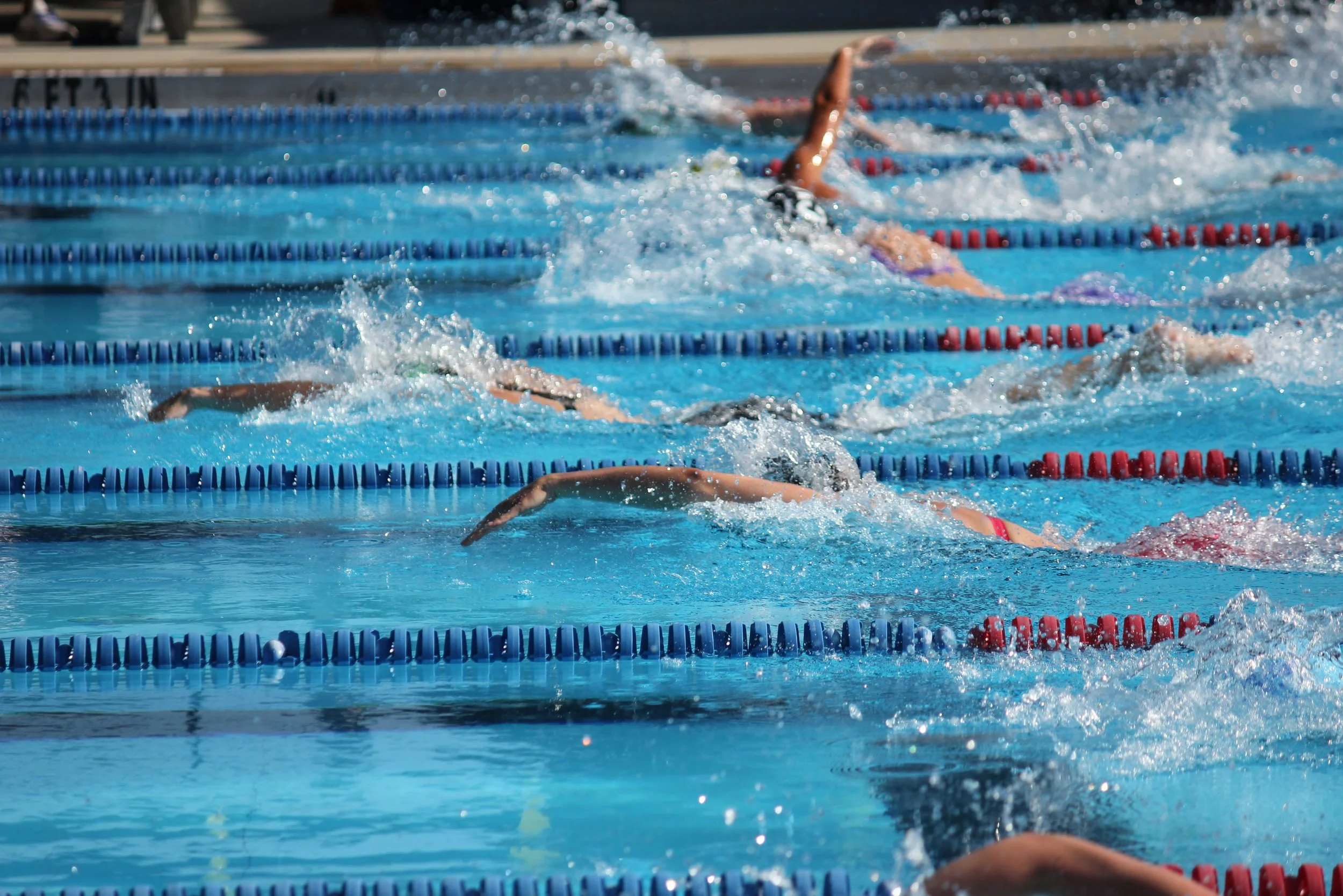 Swimmers competing in an outdoor swimming pool race, with lane markers, starting blocks, and swimming caps visible.